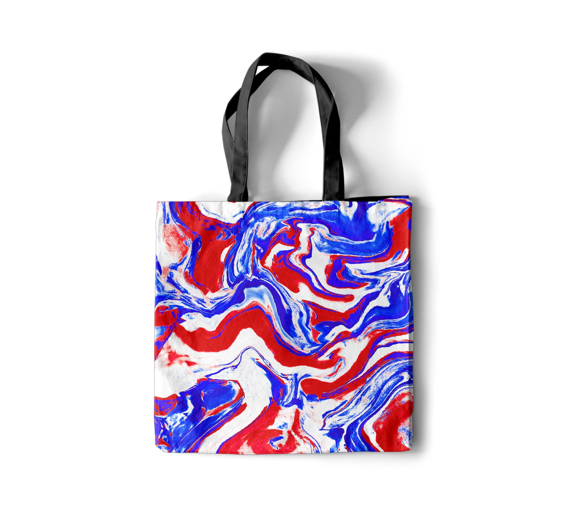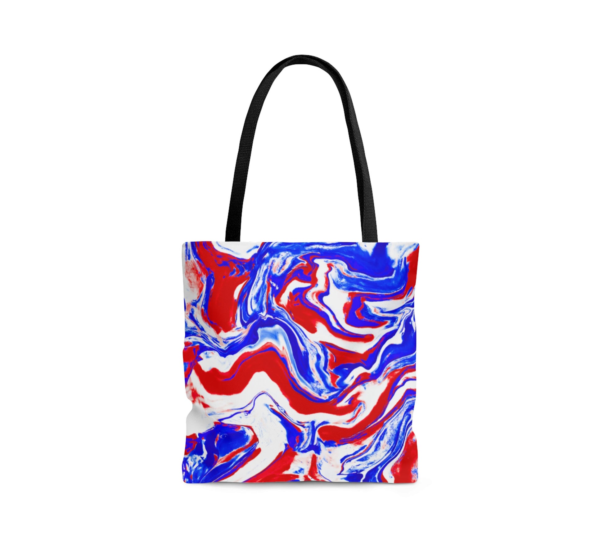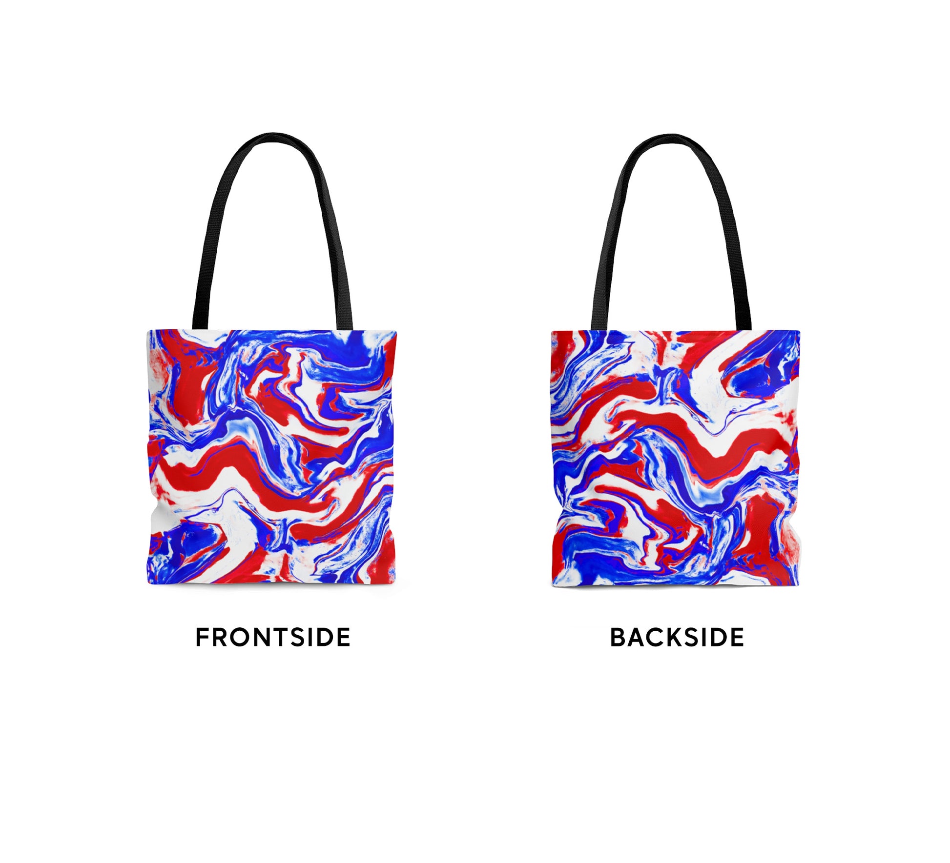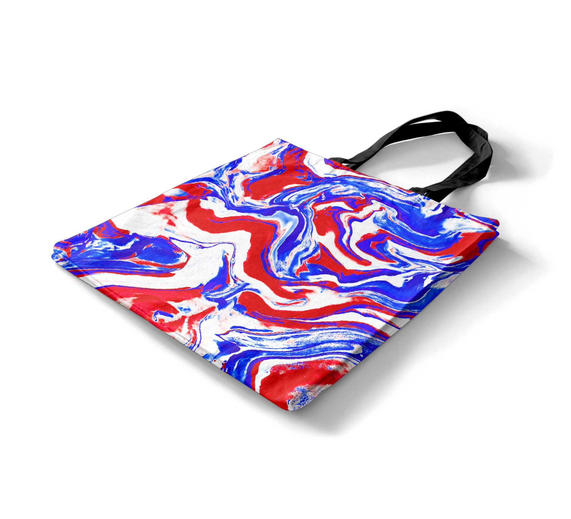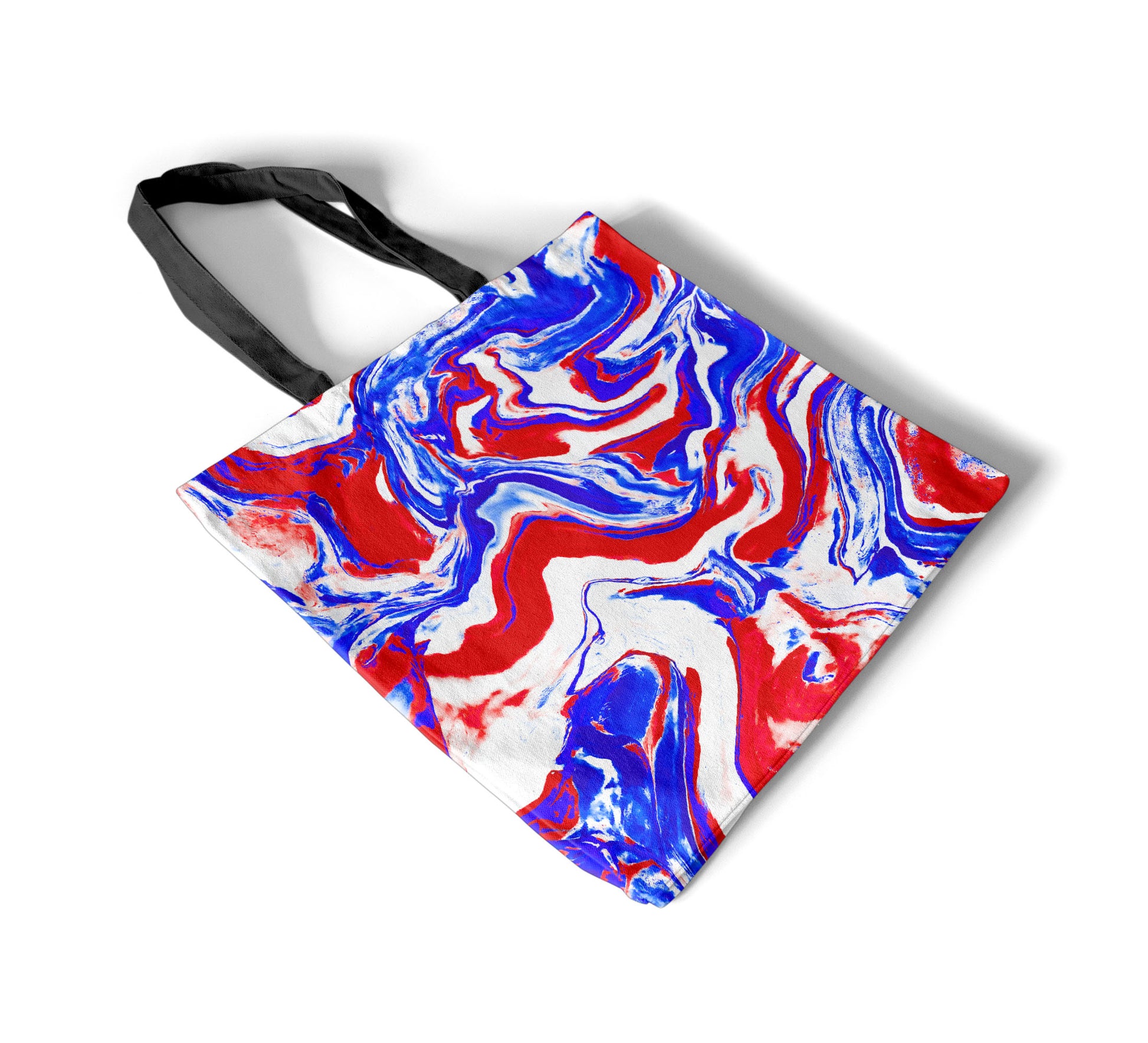 Walk around in style with this practical, high-quality large all-over print Red + White + Blue Marble Tote Bag — perfect for those that love to rock Patriotic styles! This tote bag is the perfect fashion accessory that provides comfort with style at the beach, out in the town, or for a quick overnight stay. Made from durable fabric and materials that help the tote dry quickly, retain its shape & look, lasting for seasons. The all-over print tote design is printed using the sublimation technique.